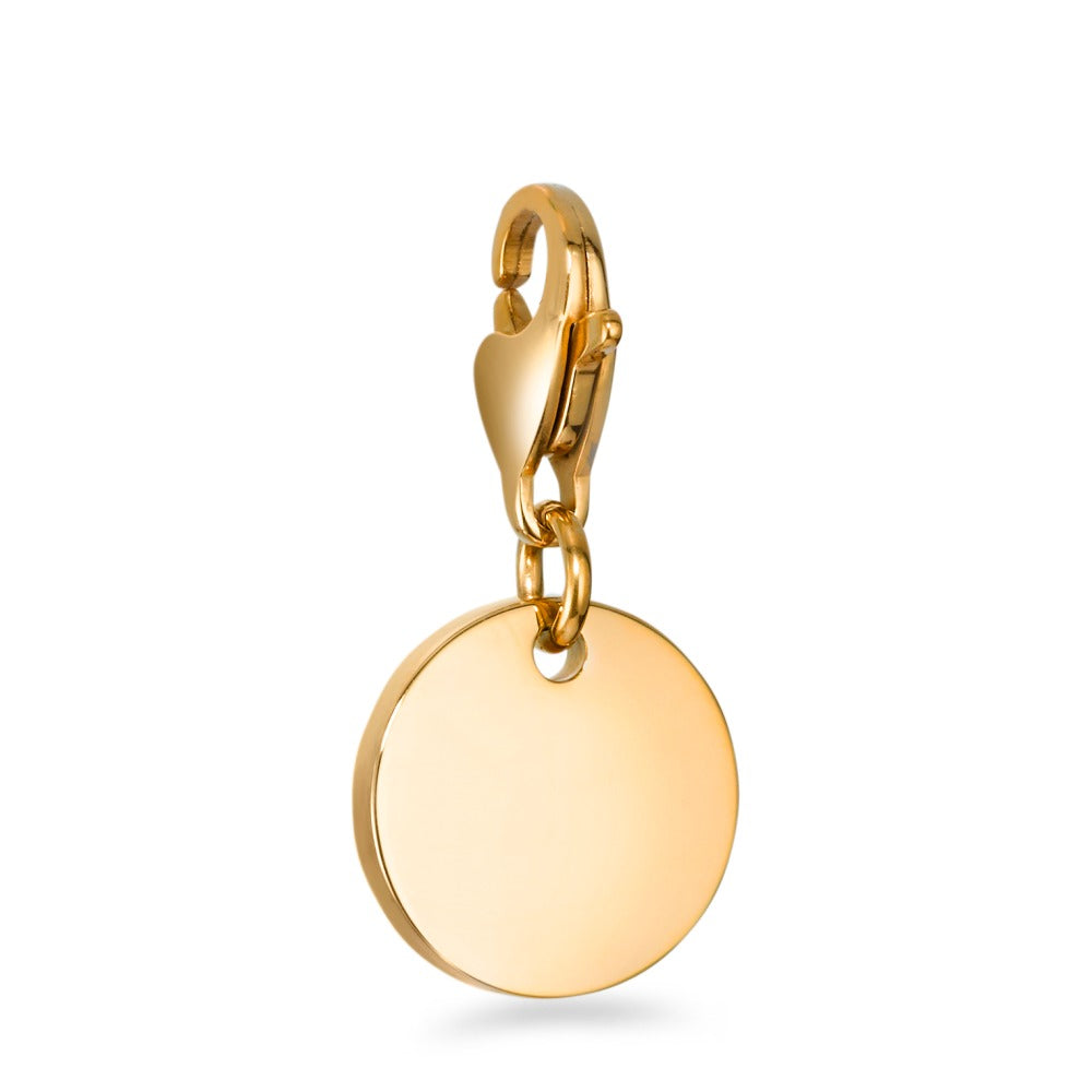Eleganter Damen Charm aus hochwertigem, goldfarbenem Edelstahl. Der runde Anhänger mit Karabinerverschluss lässt sich vielseitig an Armbändern oder Ketten befestigen und verleiht jedem Schmuckstück eine individuelle Note. Zeitloses Design, robust und hautfreundlich.