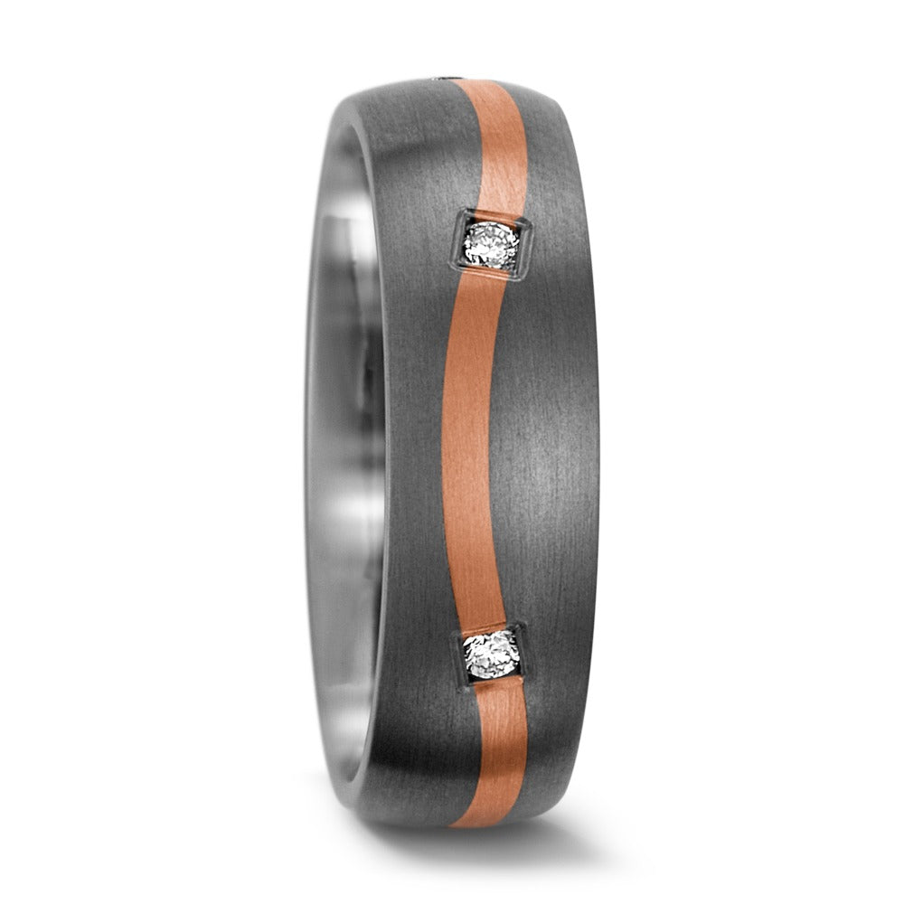 Moderner Damen-Fingerring aus robustem Titan mit elegantem Rotgold-Inlay. Zwei funkelnde Diamanten setzen edle Akzente und verleihen dem Ring zeitlose Schönheit. Perfekt für stilbewusste Frauen, die Qualität und Design in einem Schmuckstück schätzen.