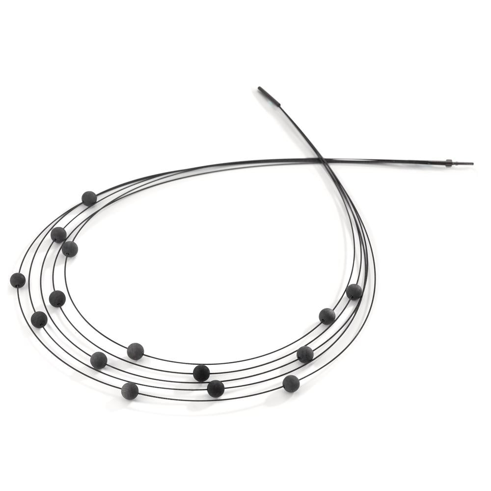 Elegantes Damen-Collier aus hochwertigem Edelstahl mit schwarzen Carbon-Elementen. Das mehrreihige Design mit feinen Drähten und mattierten Kugeln verleiht jedem Outfit eine moderne und stilvolle Note. Perfektes Accessoire für jeden Anlass – leicht, robust und zeitlos schön.